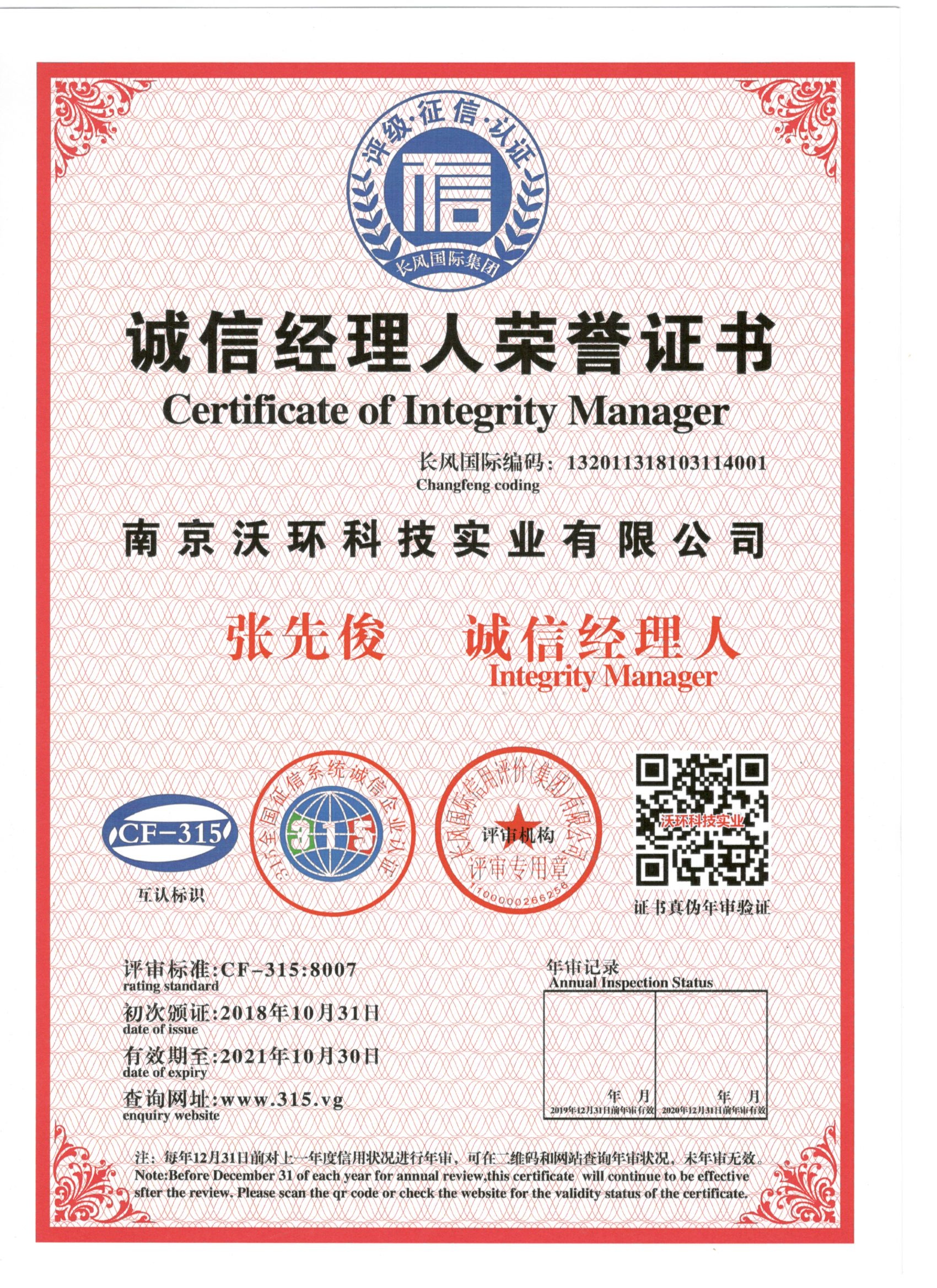 熱烈祝賀南京沃環(huán)公司張先俊先生榮獲誠(chéng)信經(jīng)理人證書