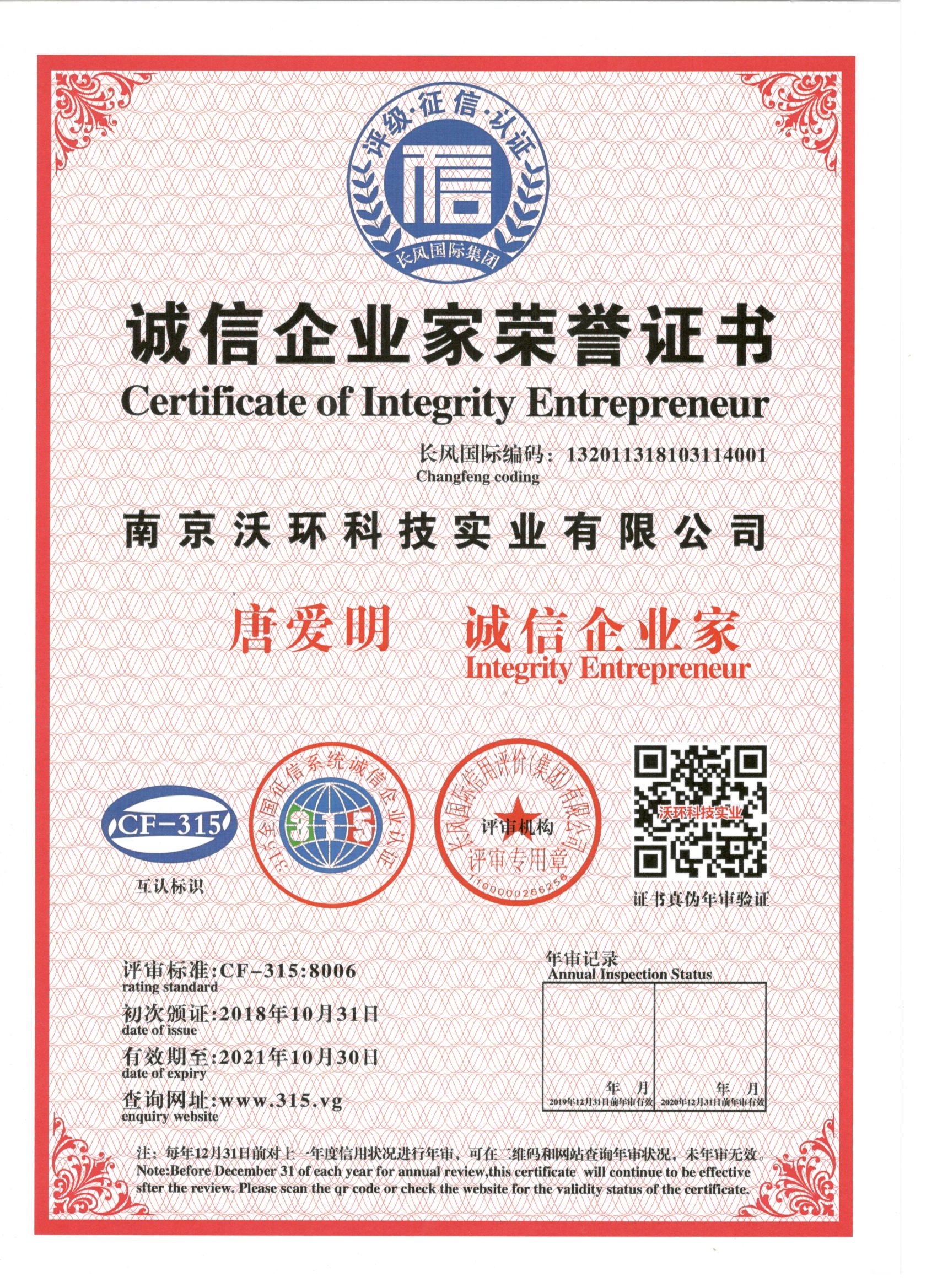 熱烈祝賀南京沃環(huán)公司唐愛明先生被專業(yè)評審機(jī)構(gòu)-長風(fēng)國際集團(tuán)評為誠信企業(yè)家,特發(fā)此證書